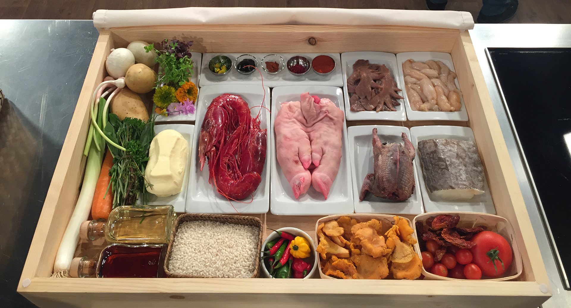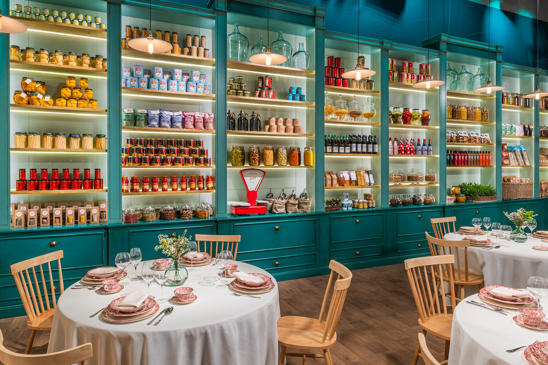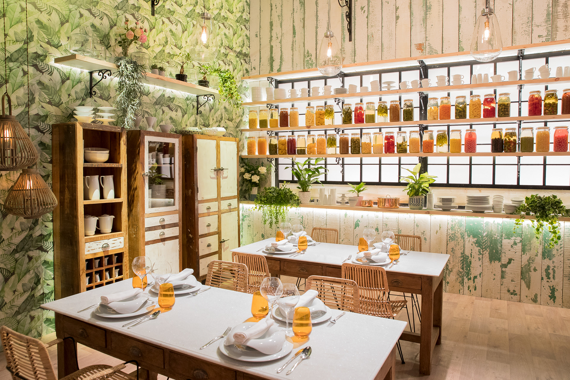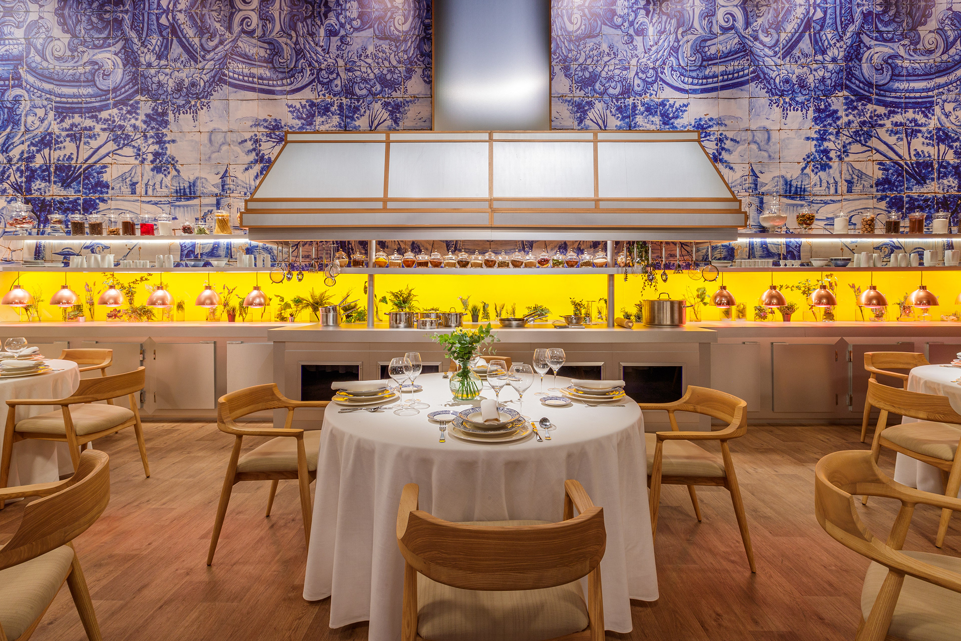 Un restaurante japonés, una estructura industrial, un patio acristalado con una lámpara pez Koi gigante de madera, un invernadero azul, un laboratorio de conservas, la cocina de la abuela, una ola de botellas de plástico, un ultramarinos de 1900, una gran cocina con un pase caliente iluminado y un mural de azulejo portugués...