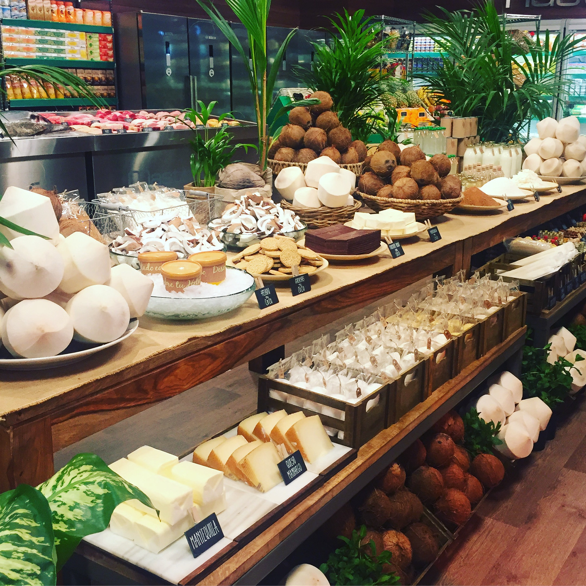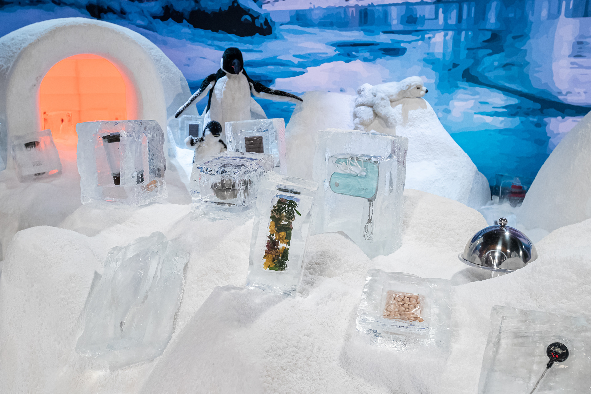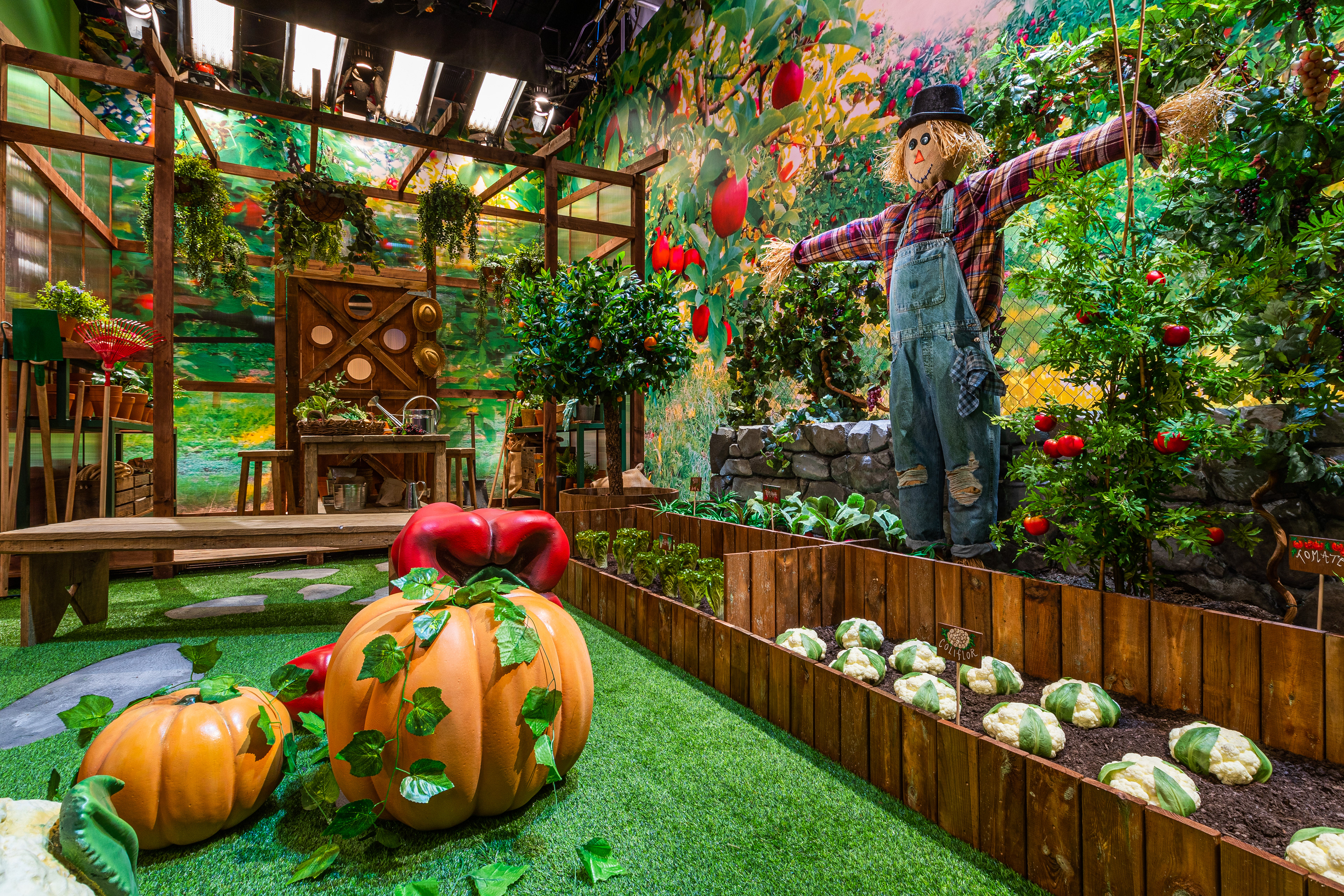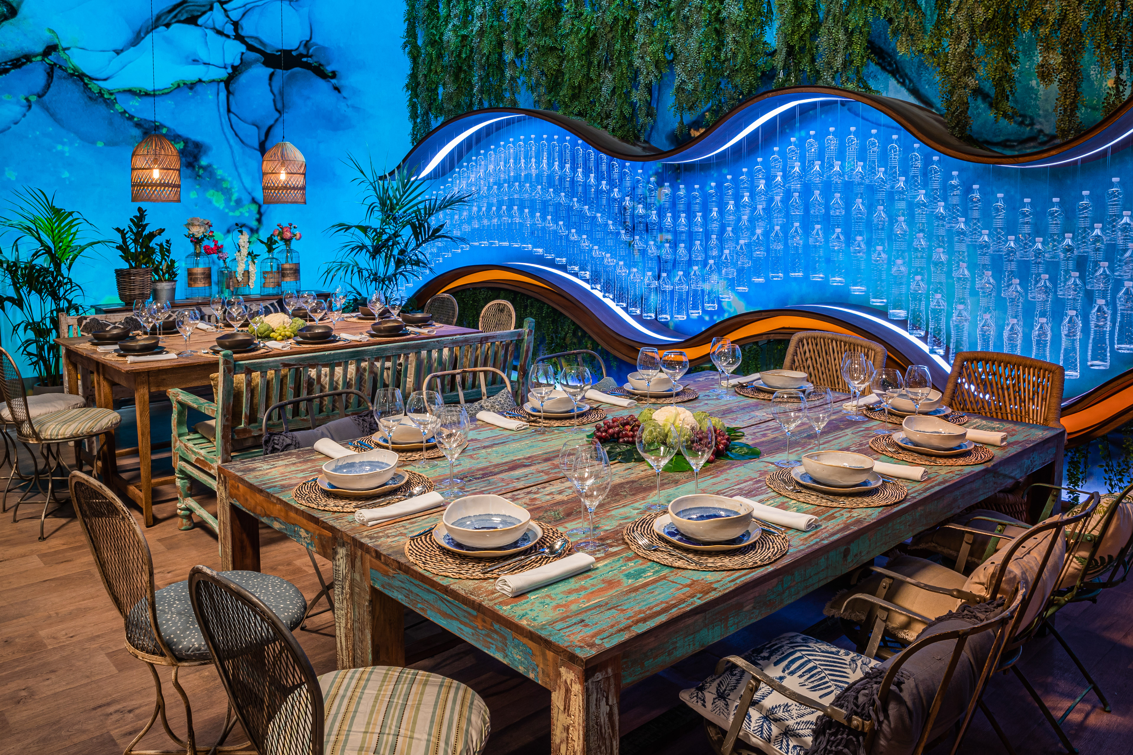 A Japanese restaurant, an industrial structure, a glass patio with a giant wooden koi lamp, a blue greenhouse, a preservation lab, Grandma’s kitchen, a wave of plastic bottles, a 1900s general store, a large kitchen with an illuminated pass, and a Portuguese tile mural…