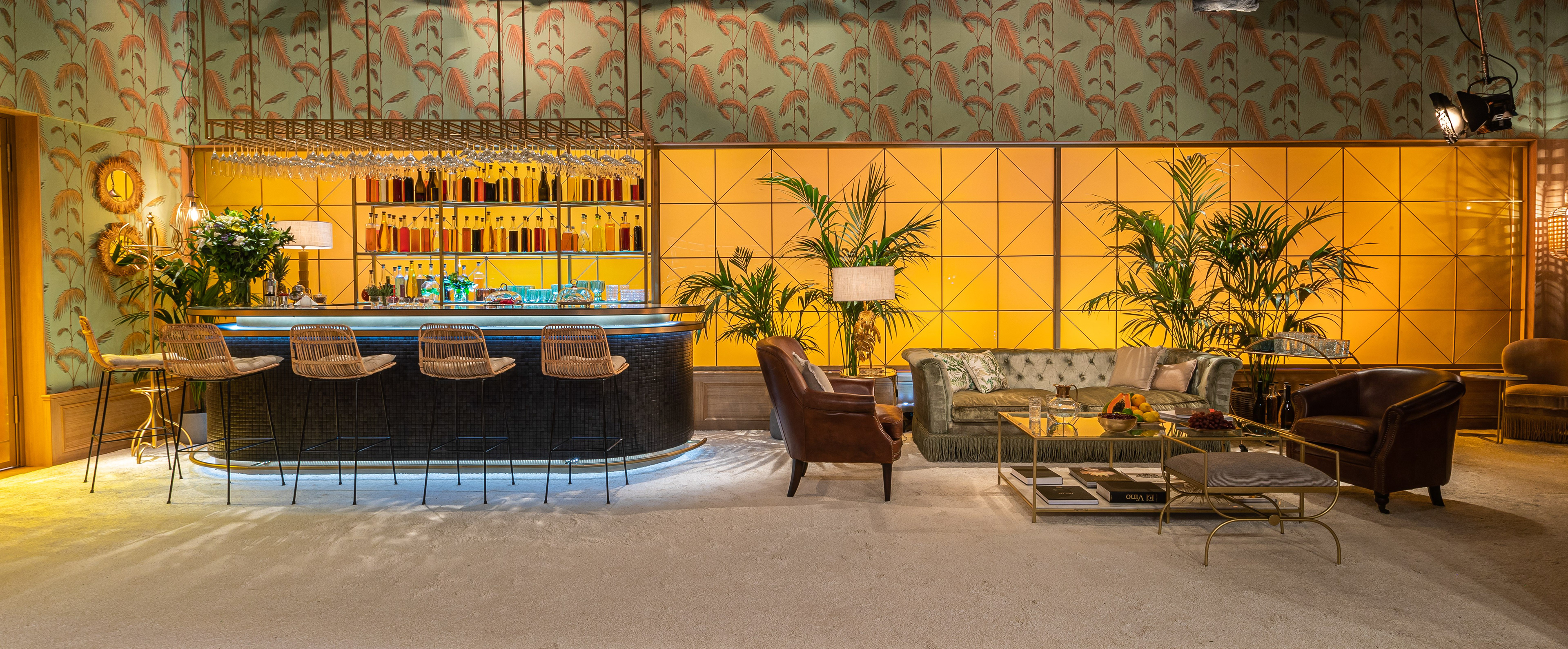 An industrial lounge, a room paying homage to Hollywood stars (mural by Abe the Ape), a theater dressing room from the early 20th century, a Japanese-inspired space, a tropical bar, a backstage area, the rooftop of an imagined MasterChef hotel…